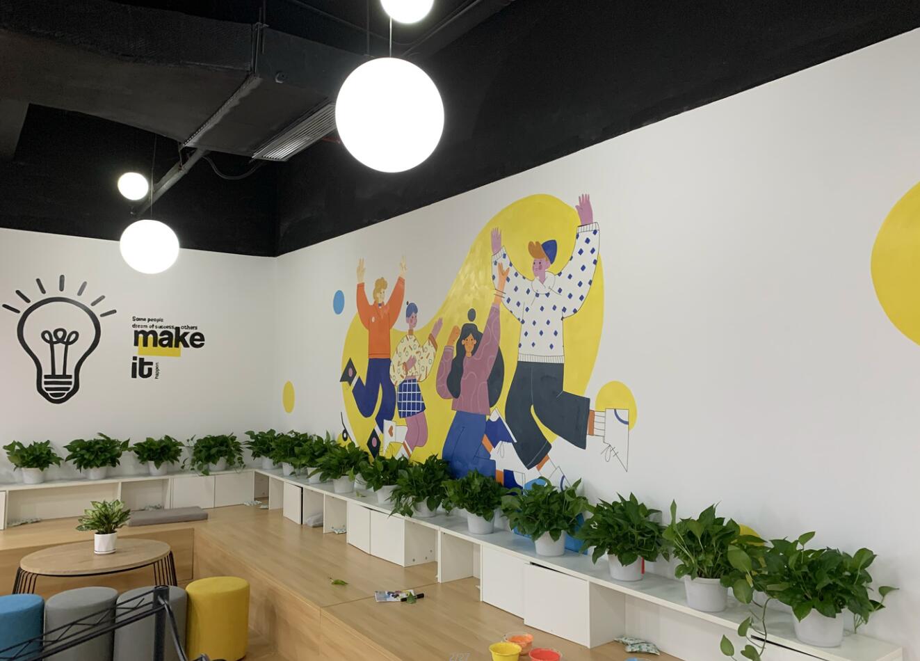 整體輕裝飾、不破壞墻體。辦公家具已入位固定,員工已陸續搬入。